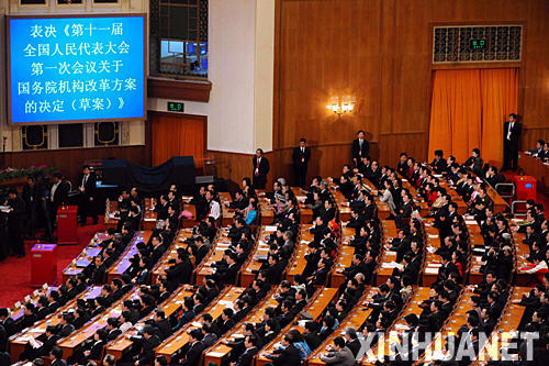 “贊成2744票……” 人民大會堂大禮堂,主席臺兩側的藍色電子屏幕上,清晰地顯示出由一組數字組成的表決結果。 時間定格在2008年3月15日上午9時06分。十一屆全國人大一次會議第五次全體會議正在舉行。 “通過!” 隨著主持會議的大會執(zhí)行主席、主席團常務主席王兆國一聲宣布,最高國家權力機關高票通過關于國務院機構改革方案的決定,批準了新時期以來的第6次國務院機構改革方案。 熱烈的掌聲在大禮堂響起…… 這是對改革方案的肯定,更寄托著對加快行政管理體制改革、建設服務型政府的殷切期盼。 從1982年到2003年,改革開放以來5輪大規(guī)模的機構改革,勾勒了行政管理體制改革推進的軌跡。 張少軍代表感慨地說:“每一次改革,都是一次深化。雖然我國現行行政管理體制基本適應經濟社會發(fā)展的要求,但政府機構和政府職能仍然存在諸多與新形勢新任務不相適應的方面,特別是與深入貫徹落實科學發(fā)展觀、構建社會主義和諧社會等重大戰(zhàn)略思想的要求還存在較大差距! “加快行政管理體制改革,建設服務型政府”——黨的十七大明確提出深化行政管理體制改革的總要求。 “到2020年建立起比較完善的中國特色社會主義行政管理體制”——黨的十七屆二中全會描繪了深化行政管理體制改革的總目標。 逐字研讀,熱烈探討,坦誠直言……大會期間,代表們對國務院機構改革方案進行了認真審議。 加強和改善宏觀調控,促進科學發(fā)展;著眼于保障和改善民生,加強社會管理和公共服務;按照探索職能有機統(tǒng)一的大部門體制要求,對一些職能相近的部門進行整合——此次改革突出的三個重點,獲得代表們的普遍認可。 “這些重點,抓住了當前深化行政管理體制改革的關鍵,體現了科學發(fā)展觀的要求!标惷鼬Q代表說。 對新一輪國務院機構改革,代表們充滿期待—— “今年是全面貫徹落實黨的十七大戰(zhàn)略部署的第一年。要按照大會通過的方案,積極穩(wěn)妥地推進國務院機構改革,確保行政管理體制改革順利進行!绷治浯肀硎尽 “要按照決策權、執(zhí)行權、監(jiān)督權既相互制約又相互協調的要求,著力優(yōu)化組織結構,規(guī)范機構設置,完善運行機制,為全面建設小康社會提供組織保障!备实烂鞔碚J為。 新一輪國務院機構改革大幕已啟!凹訌婎I導,周密部署,保證機構改革方案的順利實施”——大會決定中的這段話,道出了億萬人民共同的心聲!
