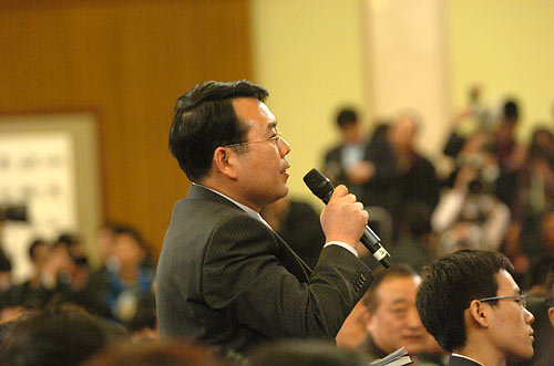 3月18日,國務(wù)院總理溫家寶和副總理李克強、回良玉、張德江、王岐山在北京人民大會堂與中外記者見面,并回答記者提問。圖為新華社記者在提問。