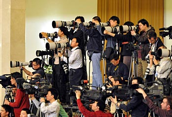 | 3月18日,國(guó)務(wù)院總理溫家寶和副總理李克強(qiáng)、回良玉、張德江、王岐山在北京人民大會(huì)堂與中外記者見面,并回答記者提問(wèn)。這是攝影、攝像記者在現(xiàn)場(chǎng)采訪拍攝。新華社記者