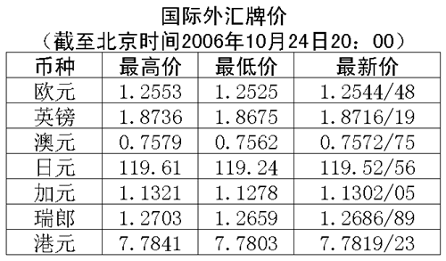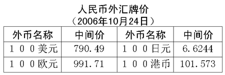 根據中國人民銀行授權中國外匯交易中心發(fā)布的公告,2006年10月24日銀行間外匯市場美元等交易貨幣對人民幣匯率的中間價為:1美元兌人民幣7.9049元,1歐元兌人民幣9.9171元,100日元兌人民幣6.6244元,1港元兌人民幣1.01573元,1英鎊兌人民幣14.8032元。