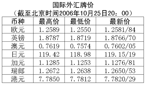 根據(jù)中國人民銀行授權(quán)中國外匯交易中心發(fā)布的公告,2006年10月25日銀行間外匯市場美元等交易貨幣對人民幣匯率的中間價為:1美元兌人民幣7.9007元,1歐元兌人民幣9.9255元,100日元兌人民幣6.6231元,1港元兌人民幣1.01490元,1英鎊兌人民幣14.8036元。