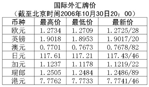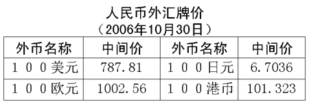 根據(jù)中國(guó)人民銀行授權(quán)中國(guó)外匯交易中心發(fā)布的公告,2006年10月30日銀行間外匯市場(chǎng)美元等交易貨幣對(duì)人民幣匯率的中間價(jià)為:1美元兌人民幣7.8781元,1歐元兌人民幣10.0256元,100日元兌人民幣6.7036元,1港元兌人民幣1.01323元,1英鎊兌人民幣14.9461元。