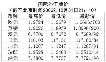 根據(jù)中國人民銀行授權(quán)中國外匯交易中心發(fā)布的公告,2006年10月31日銀行間外匯市場美元等交易貨幣對人民幣匯率的中間價為:1美元兌人民幣7.8792元,1歐元兌人民幣10.0168元,100日元兌人民幣6.6983元,1港元兌人民幣1.01335元,1英鎊兌人民幣14.9681元。