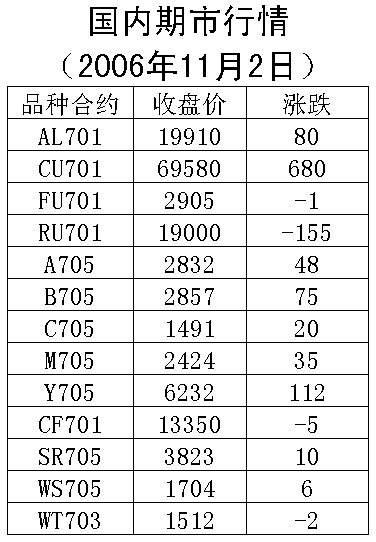 2日,國內(nèi)期貨市場銅、膠下跌,其余品種上漲。