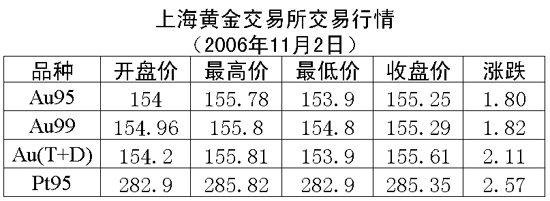2日,上海黃金交易所各個交易品種全線上漲,黃金Au99.95收盤于155.25元/克,上漲1.80元/克,共成交3262公斤;黃金Au99.99收盤于155.29元/克,上漲1.82元/克,共成交1108.40公斤;鉑金Pt99.95收盤于285.35元/克,上漲2.57元/克,共成交80公斤;黃金Au(T+D)延期交易品種收盤于155.61元/克,上漲2.11元/克,共成交5684公斤。