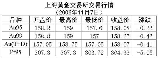 7日,上海黃金交易所黃金Au99.95收盤(pán)于158.08元/克,下跌0.23元/克,共成交2198公斤;黃金Au99.99收盤(pán)于158.25元/克,下跌0.43元/克,共成交621.40公斤;鉑金Pt99.95收盤(pán)于304.33元/克,下跌5.05元/克,共成交78公斤;黃金Au(T+D)延期交易品種收盤(pán)于158.07元/克,下跌0.41元/克,共成交3216公斤。