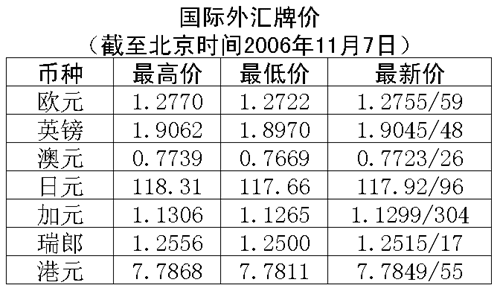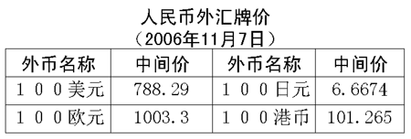 根據(jù)中國(guó)人民銀行授權(quán)中國(guó)外匯交易中心發(fā)布的公告,2006年11月7日銀行間外匯市場(chǎng)美元等交易貨幣對(duì)人民幣匯率的中間價(jià)為:1美元兌人民幣7.8829元,1歐元兌人民幣10.0330元,100日元兌人民幣6.6674元,1港幣兌人民幣1.01265元,1英鎊兌人民幣14.9694元。