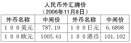 根據(jù)中國人民銀行授權(quán)中國外匯交易中心發(fā)布的公告,2006年11月8日銀行間外匯市場(chǎng)美元等交易貨幣對(duì)人民幣匯率的中間價(jià)為:1美元兌人民幣7.8719元,1歐元兌人民幣10.0561元,100日元兌人民幣6.6898元,1港幣兌人民幣1.01102元,1英鎊兌人民幣15.0027元。
