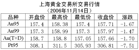 14日,上海黃金交易所黃金Au99.95收盤于157.71元/克,下跌1.67元/克,共成交1608公斤;黃金Au99.99收盤于157.97元/克,下跌1.47元/克,共成交719.60公斤;鉑金Pt99.95收盤于306.81元/克,下跌7.51元/克,共成交88公斤;黃金Au(T+D)延期交易品種收盤于157.66元/克,下跌1.70元/克,共成交2550公斤。
