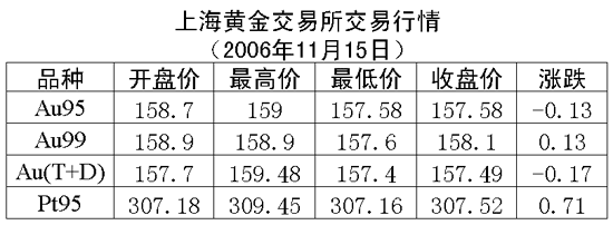 15日,上海黃金交易所黃金Au99.95成交價(jià)為157.59元/克,下跌0.12元/克;黃金Au99.99成交價(jià)為158.15元/克,上漲0.18元/克;鉑金Pt99.95成交價(jià)為307.42元/克,上漲0.61元/克;黃金Au(T+D)延期交易品種成交價(jià)為157.50元/克,下跌016.元/克。