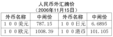 根據(jù)中國(guó)人民銀行授權(quán)中國(guó)外匯交易中心發(fā)布的公告,2006年11月15日銀行間外匯市場(chǎng)美元等交易貨幣對(duì)人民幣匯率的中間價(jià)為:1美元兌人民幣7.8715元,1歐元兌人民幣10.0839元,100日元兌人民幣6.6895元,1港幣兌人民幣1.01105元,1英鎊兌人民幣14.9251元。
