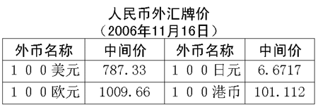 根據(jù)中國人民銀行授權(quán)中國外匯交易中心發(fā)布的公告,2006年11月16日銀行間外匯市場美元等交易貨幣對(duì)人民幣匯率的中間價(jià)為:1美元兌人民幣7.8733元,1歐元兌人民幣10.0966元,100日元兌人民幣6.6717元,1港幣兌人民幣1.01112元,1英鎊兌人民幣14.8693元。
