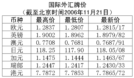 根據(jù)中國(guó)人民銀行授權(quán)中國(guó)外匯交易中心發(fā)布的公告,2006年11月21日銀行間外匯市場(chǎng)美元等交易貨幣對(duì)人民幣匯率的中間價(jià)為:1美元兌人民幣7.8695元,1歐元兌人民幣10.0917元,100日元兌人民幣6.6685元,1港幣兌人民幣1.01059元,1英鎊兌人民幣14.9383元。