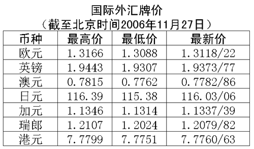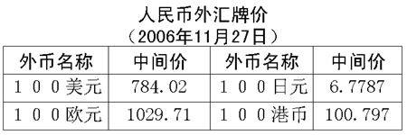 根據(jù)中國人民銀行授權(quán)中國外匯交易中心發(fā)布的公告,2006年11月27日銀行間外匯市場(chǎng)美元等交易貨幣對(duì)人民幣匯率的中間價(jià)為:1美元兌人民幣7.8402元,1歐元兌人民幣10.2971元,100日元兌人民幣6.7787元,1港幣兌人民幣1.00797元,1英鎊兌人民幣15.2001元。在自動(dòng)撮合交易系統(tǒng),美元收于人民幣7.8428元,低于24日收盤時(shí)的7.8506元,盤中交易區(qū)為人民幣7.8432-7.8406元。在詢價(jià)交易市場(chǎng),美元收于人民幣7.8436元,低于24日收盤時(shí)的7.8525元,盤中交易區(qū)為人民幣7.8441-7.8410元。