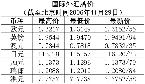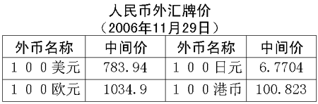 根據(jù)中國人民銀行授權(quán)中國外匯交易中心發(fā)布的公告,2006年11月29日銀行間外匯市場美元等交易貨幣對人民幣匯率的中間價為:1美元兌人民幣7.8394元,1歐元兌人民幣10.3490元,100日元兌人民幣6.7704元,1港幣兌人民幣1.00823元,1英鎊兌人民幣15.3113元。