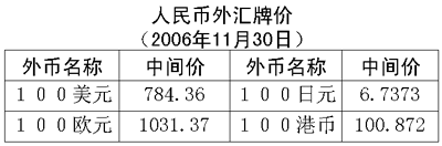 根據(jù)中國人民銀行授權中國外匯交易中心發(fā)布的公告,2006年11月30日銀行間外匯市場美元等交易貨幣對人民幣匯率的中間價為:1美元兌人民幣7.8436元,1歐元兌人民幣10.3137元,100日元兌人民幣6.7373元,1港幣兌人民幣1.00872元,1英鎊兌人民幣15.2629元。