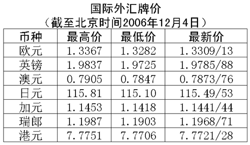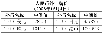 根據(jù)中國人民銀行授權(quán)中國外匯交易中心發(fā)布的公告,2006年12月4日銀行間外匯市場美元等交易貨幣對人民幣匯率的中間價為:1美元兌人民幣7.8240元,1歐元兌人民幣10.4404元,100日元兌人民幣6.7875元,1港幣兌人民幣1.00643元,1英鎊兌人民幣15.4992元。