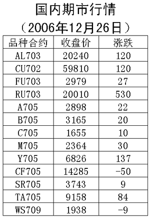 由于圣誕節(jié)影響外盤25日休市。滬銅705合約26日上漲120元/噸,收盤59810元/噸。由于銅價跌勢沒有結(jié)束,不建議抓反彈,滬鋁703合約26日上漲120元/噸,收盤20240元/噸。鋁價仍在上升通道當中,建議逢低買進。