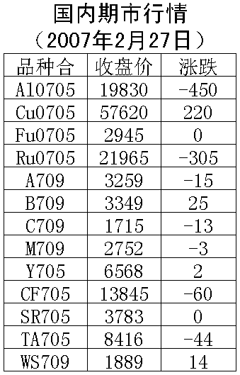 27日,國內期貨市場銅、糖、豆油、強麥上漲,其余品種下跌。