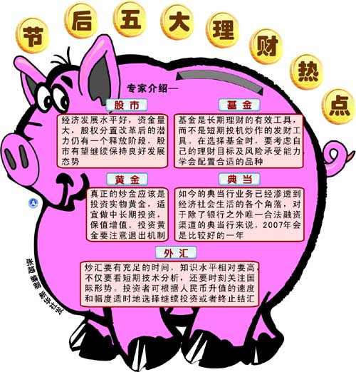 辭舊迎新的時節(jié),基金公司忙著分紅,保險公司急著推出新產(chǎn)品,銀行的人民幣理財產(chǎn)品更是拉開陣勢搞促銷。剛剛享受過2006年紅紅火火的理財經(jīng)歷,使得人們在走親訪友、恭賀農(nóng)歷新年之余,也大都開始悄悄地為自己謀劃新年的“發(fā)財計(jì)劃”。