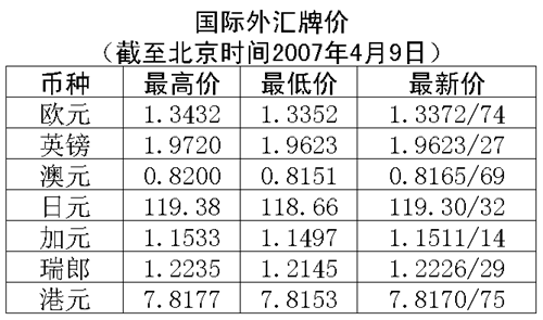 根據(jù)中國人民銀行授權(quán)中國外匯交易中心發(fā)布的公告,2007年4月9日銀行間外匯市場美元等交易貨幣對人民幣匯率的中間價為:1美元兌人民幣7.7290元,1歐元兌人民幣10.3279元,100日元兌人民幣6.4748元,1港幣兌人民幣0.98874元,1英鎊兌人民幣15.1805元。