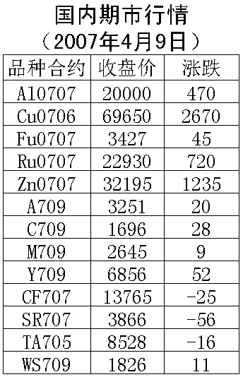 4月9日國(guó)內(nèi)期貨市場(chǎng)白糖下跌,金屬、能源、農(nóng)產(chǎn)品價(jià)格全部飄紅。倫敦、美國(guó)市場(chǎng)上周五因復(fù)活節(jié)休市。滬銅706合約周一上漲2670元/噸,收盤69650元/噸,支撐價(jià)位68000元一線,上漲壓力71500元一線。滬鋁706合約周一上漲360元/噸,收盤19860元/噸,支撐19600元一線,上漲壓力20300元一線。