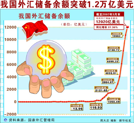 我國外匯儲備余額突破1.2萬億美元[圖]