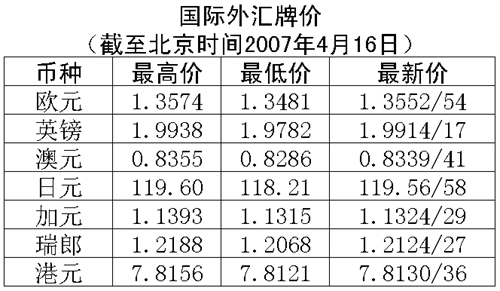 根據(jù)中國人民銀行授權中國外匯交易中心發(fā)布的公告,2007年4月16日銀行間外匯市場美元等交易貨幣對人民幣匯率的中間價為:1美元兌人民幣7.7220元,1歐元兌人民幣10.4726元,100日元兌人民幣6.4795元,1港幣兌人民幣0.98833元,1英鎊兌人民幣15.3455元。至此,匯改以來人民幣累計升值幅度已超過5%。