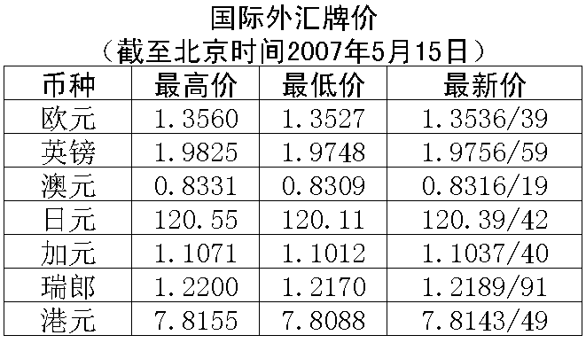 根據(jù)中國(guó)人民銀行授權(quán)中國(guó)外匯交易中心發(fā)布的公告,2007年5月15日銀行間外匯市場(chǎng)美元等交易貨幣對(duì)人民幣匯率的中間價(jià)為:1美元兌人民幣7.6948元,1歐元兌人民幣10.4203元,100日元兌人民幣6.3844元,1港幣兌人民幣0.98524元,1英鎊兌人民幣15.2272元。