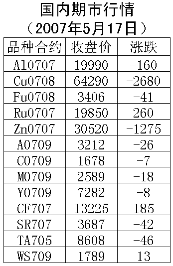 17日國(guó)內(nèi)期貨市場(chǎng)金屬大幅下跌。倫敦銅周三下跌110美元/噸,收盤7630元/噸。滬銅707合約周四下跌2670元/噸,收盤63970元/噸達(dá)到跌停板,明日漲跌幅度擴(kuò)大到5%,支撐價(jià)位63000元一線,上漲壓力65000元一線。倫敦鋁周三下跌4。5美元/噸,收盤2838美元/噸。滬鋁707合約周三下跌160元/噸,收盤19990元/噸。