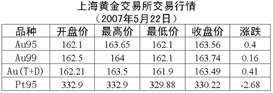 22日,上海黃金交易所黃金Au100g收盤于166.67元/克,上漲1.51元/克,共成交1公斤;黃金Au99.95收盤于163.56元/克,上漲0.40元/克,共成交2498公斤;黃金Au99.99收盤于163.74元/克,上漲0.16元/克,共成交416.20公斤;鉑金Pt99.95收盤于330.22元/克,下跌2.68元/克,共成交238公斤;黃金Au(T+D)遞延交易品種收盤于163.49元/克,上漲0.41元/克,共成交1820公斤。