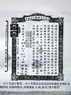 張謇的集資難,比較典型的反映了19世紀末20世紀初轉型期中國社會中的一種正常現象。 當然,在大生紗廠迭獲利潤,張謇也“稍獲資本家之信用”后,情況就會大不一樣了,此后,張謇在籌辦大生分廠時,“不一年而得投資者六十余萬”的事實就證明了這一點。 這里介紹的大生企業(yè)集團的第二個特點,是它在快速擴張中的一種集資方式。 大生紗廠獲利之后,在短短的10多年時間里,張謇的企業(yè)從一個擴大到20多個,包括紡織、印染、航運、面粉、鹽業(yè)、鐵冶等等,還投資10余個其它企業(yè),形成了一個以紡織為主跨行業(yè)的資本企業(yè)集團。另外,張謇還在南通投資創(chuàng)辦了中國第一所紡織學校,第一個師范學校、第一個博物館……在南通的城市建設和現代化發(fā)展方面,發(fā)揮了很大的作用。 張謇曾對人說:“我們儒家,有一句扼要而不可動搖的名言‘天地之大德曰生’。這句話的解釋,就是說一切政治及學問最低的期望,要使得大多數的老百姓,都能得到最低水平線上的生活”。因此,他把自己創(chuàng)辦的企業(yè)命名為“大生”,就是“天地之大德曰生”的涵義。如果說,張謇的這種做法,是秉持他自己的信念,那么,創(chuàng)辦這些企業(yè)和社會公益事業(yè)的資金從何而來?除向社會籌集外,將企業(yè)經營利潤轉為股份,壯大自身實力和競爭力量,爭取獲取更多利潤興辦更多實業(yè)和社會公益事業(yè)是張謇的主要辦法。這張“中華民國”4年發(fā)行的“南通大生紡織公司股票”,票面文字中有“南通大生紡織公司為添給股票事,本公司按照辛亥年股東會議決,以歷年截存余利作為添購紗錠織機股本,每股規(guī)銀五拾兩,按戶填給……”的字樣,就是張謇將企業(yè)利潤轉為企業(yè)股票的見證。因此,票面中有“添字第……號”的排號,這種股票也被稱為“添字股票”。這種以截存企業(yè)利潤轉為股份被稱為“添字股票”的事例,在中國近代是很有特色的一種股票。