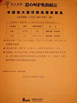 | “陽光理財T計劃”是光大銀行推出的人民幣信托投資理財產(chǎn)品,今年已經(jīng)發(fā)行了12期。本報實習(xí)生 唐瑾瑾