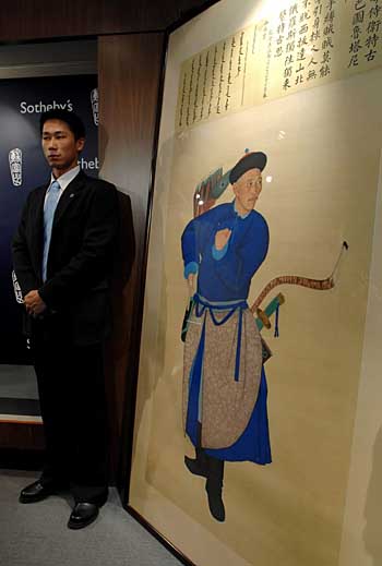 圖為清乾隆帝御制的“平定西域紫光閣五十功臣像贊頭等侍衛(wèi)勇巴圖魯伊薩穆”的設(shè)色絹本掛軸,估價(jià)超過(guò)1200萬(wàn)港元。