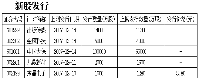 本周,太平洋保險(xiǎn)(集團(tuán))股份有限公司將以集團(tuán)整體上市方式登陸A股市場(chǎng),將成為A股市場(chǎng)第一家真正意義上的保險(xiǎn)集團(tuán)上市公司。太平洋保險(xiǎn)A股首發(fā)規(guī)模為10億股,其中將于12月14日網(wǎng)上發(fā)行6.5億股,募集資金將全部用于充實(shí)資本金。 太平洋保險(xiǎn)是綜合性保險(xiǎn)集團(tuán)公司之一,主要通過(guò)太平洋壽險(xiǎn)、太平洋產(chǎn)險(xiǎn)為客戶(hù)提供人身及財(cái)產(chǎn)保險(xiǎn)產(chǎn)品和服務(wù),通過(guò)太平洋資產(chǎn)管理公司綜合管理和運(yùn)用保險(xiǎn)資金。太平洋保險(xiǎn)2006年和2007年上半年在人壽保險(xiǎn)市場(chǎng)排名第三,市場(chǎng)份額分別為9.3%和9.5%;2006年和2007年上半年在財(cái)產(chǎn)保險(xiǎn)市場(chǎng)排名第二,市場(chǎng)份額分別為11.5%和11.6%。2005年和2006年,壽險(xiǎn)業(yè)務(wù)保費(fèi)收入分別比上年增長(zhǎng)4.6%和4.5%,產(chǎn)險(xiǎn)業(yè)務(wù)保費(fèi)收入分別比上年增長(zhǎng)15.8%和23.8%。 此外,本周還有四只新股發(fā)行。12月10日,東晶電子將網(wǎng)上發(fā)行1280萬(wàn)股,占本次發(fā)行總量的80%,發(fā)行價(jià)格8.8元/股。公司主要從事石英晶體元器件產(chǎn)品的研發(fā)、生產(chǎn)和銷(xiāo)售。截至2007年6月30日,公司已擁有年產(chǎn)SMD石英晶體諧振器1.1億只、DIP石英晶體諧振器2億只、瓷介管狀電容器5億只的生產(chǎn)能力。國(guó)都證券的新股報(bào)告表示,預(yù)計(jì)公司2007至2009年業(yè)績(jī)按發(fā)行后股本計(jì)算為0.45、0.61、0.83元/股。 12月11日,九鼎新材將網(wǎng)上發(fā)行1600萬(wàn)股,占本次發(fā)行總量的80%。公司目前致力于玻纖深加工制品的生產(chǎn)經(jīng)營(yíng),主要產(chǎn)品包括紡織型玻纖深加工制品及玻璃制品兩大類(lèi)。 12月14日,金風(fēng)科技和出版?zhèn)髅絻芍恍鹿梢矊l(fā)行,金風(fēng)科技將網(wǎng)上發(fā)行4000萬(wàn)股,占發(fā)行數(shù)量的80%,出版?zhèn)髅綄⒕W(wǎng)上發(fā)行11200萬(wàn)股,占發(fā)行數(shù)量的80%。 金風(fēng)科技是家純風(fēng)電設(shè)備類(lèi)公司,其主營(yíng)業(yè)務(wù)收入的幾乎百分之百都是風(fēng)電業(yè)務(wù)。 遼寧出版?zhèn)髅阶?cè)資本41091.47萬(wàn)元,總股本為41091.47萬(wàn)股。遼寧出版集團(tuán)有限公司持有股份公司總股本的98.05%。遼寧電視臺(tái)廣告?zhèn)鞑ブ行某钟泄煞莨究偣杀镜?.95%。公司旗下有5家出版社、5家發(fā)行公司、2家票據(jù)印務(wù)和印刷物資購(gòu)銷(xiāo)企業(yè)。截至2006年12月31日,公司資產(chǎn)總額11.3億元,營(yíng)業(yè)收入為10.1億元,凈利潤(rùn)為9049.9萬(wàn)元。本次發(fā)行1.4億A股,占發(fā)行后總股本的25.41%,發(fā)行后總股本將達(dá)到5.5億股。