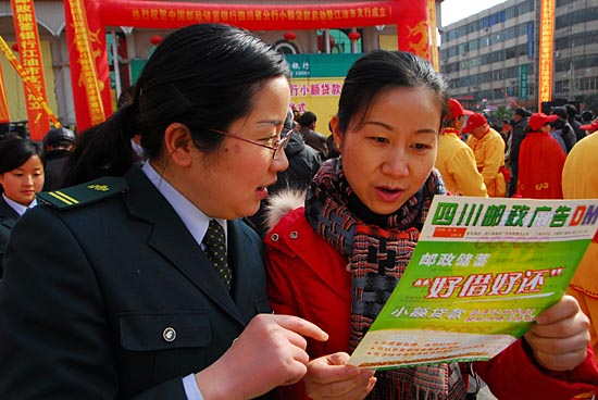 1月31日,中國(guó)郵政儲(chǔ)蓄銀行江油市支行工作人員(左)正在向一名當(dāng)?shù)貍(gè)體工商戶(hù)陳女士介紹小額貸款業(yè)務(wù)。 當(dāng)日,中國(guó)郵政儲(chǔ)蓄銀行四川省分行正式啟動(dòng)小額貸款業(yè)務(wù)試點(diǎn)。這是繼郵政儲(chǔ)蓄存單質(zhì)押貸款之后,中國(guó)郵政儲(chǔ)蓄為廣大小企業(yè)主和農(nóng)戶(hù)開(kāi)辟的一個(gè)新的貸款渠道,有望2008年在四川全省推廣。 | |