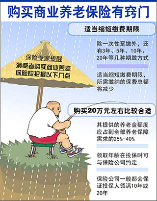 近期以來,隨著事業(yè)單位養(yǎng)老金改革試點的啟動,退休養(yǎng)老問題再次成為一個人們熱議的話題。由于國內(nèi)老齡化程度的日益提高和退休金替代率(即占退休前工資比例)的逐年下降,傳統(tǒng)的社保退休金已遠遠不能滿足人們退休以后的生活需求,越來越多的老百姓通過購買商業(yè)養(yǎng)老保險來保障他們的老年生活。專家就此提醒人們,商業(yè)保險越早買越好;在當前經(jīng)濟困難時期,消費者可以通過適當縮短繳費期限來減少保費支出。