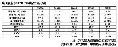 銀河證券認為,公司的營業(yè)收入同比增長3.44%,呈現(xiàn)平穩(wěn)增長的態(tài)勢。由于公司的主要收入來源是航空產(chǎn)品,在沒有新型號推出的情況下,客戶需求難以出現(xiàn)大幅增長。因此銀河證券預(yù)計未來一兩年,公司的業(yè)務(wù)仍將保持平穩(wěn)增長。航空產(chǎn)品的大幅增長可能在2011年以后,主要驅(qū)動因素包括新型號產(chǎn)品的推出,和民用直升機的有效需求被激發(fā)。