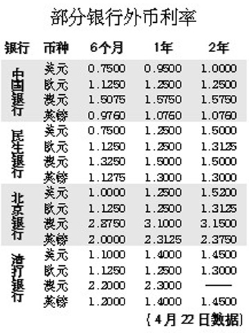 在所有的理財(cái)方式中,儲蓄存款被認(rèn)為是最為安全、保守的一種。不少人誤以為各個(gè)銀行的外幣存款利率是一致的,其實(shí)不然,外幣存款利率在不同的銀行間是有差異的。 近期,由于國際金融市場利率持續(xù)下降,不少銀行下調(diào)了小額(300萬美元以下)外幣存款的利率。例如,4月11日,工商銀行調(diào)整境內(nèi)美元、港幣、英鎊、加元小額存款利率;建設(shè)銀行4月10日起調(diào)整境內(nèi)美元存款利率;此外,農(nóng)行于3月26日下調(diào)了英鎊、澳元、加元、新加坡元、瑞士法郎5種外幣存款利率;中國銀行于3月25日下調(diào)英鎊、澳元的外幣存款利率。 記者了解到,利率下調(diào)后,在某些幣種上,各銀行間的存款利率差異仍然很大。以美元為例,有的銀行二年期的存款利率為1.00%,有的為1.50%,而北京銀行的二年期美元存款利率則為1.52%。澳元方面,差異就更為明顯,北京銀行一年期的澳元存款利率為3.10%,遠(yuǎn)遠(yuǎn)高于其他銀行的1.50%。英鎊方面,北京銀行和深圳發(fā)展銀行的一年期英鎊存款利率為2.3125%,也高于1.25%左右的平均利率水平。