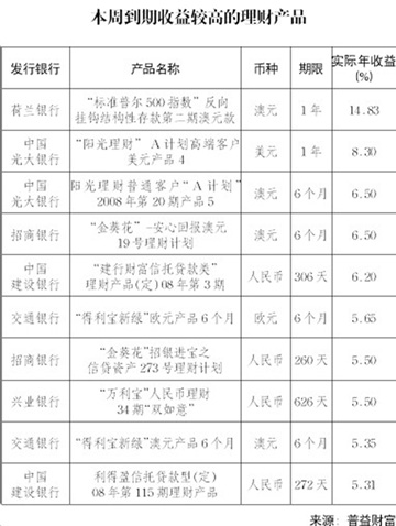 據(jù)普益財富不完全統(tǒng)計,本周(2009年5月1日至5月7日)67款銀行理財產(chǎn)品到期,到期的理財產(chǎn)品全部實現(xiàn)了預期收益,理財產(chǎn)品到期收益實現(xiàn)率達到了100%,并且未出現(xiàn)理財產(chǎn)品提前終止的現(xiàn)象。 本周到期的理財產(chǎn)品以信貸與票據(jù)資產(chǎn)類、債券與貨幣市場類為主,與前幾周相比,最大的區(qū)別是本周到期的信貸資產(chǎn)類理財產(chǎn)品均實現(xiàn)了預期收益并且未出現(xiàn)提前終止的現(xiàn)象。這主要在于部分理財產(chǎn)品在降息后發(fā)行,在理財產(chǎn)品設計中已經(jīng)考慮了利率因素,特別是前期提前終止現(xiàn)象較多的銀行,目前其到期理財產(chǎn)品絕大部分在降息之后發(fā)行。 本周到期的結構性理財產(chǎn)品的掛鉤對象分別為利率、價格和指數(shù),掛鉤標的的走勢與理財產(chǎn)品設計的獲利條件相符,所以到期也都全部實現(xiàn)了預期收益。不過需要指出的是,這并不代表結構性理財產(chǎn)品將不會出現(xiàn)零收益等不理想的表現(xiàn)。此外,到期的1款投資于收益權的理財產(chǎn)品也實現(xiàn)了預期收益,本周沒有證券投資類和新股申購類理財產(chǎn)品到期。到期收益較高的理財產(chǎn)品中,信貸資產(chǎn)類和外幣保證收益理財產(chǎn)品的占比仍舊最高。 截至2009年5月7日,正在運行的338款QDII理財產(chǎn)品中,20款理財產(chǎn)品實現(xiàn)了正收益,比上周大幅增加4款,其中花旗銀行與渣打銀行各占2款。中國農(nóng)業(yè)銀行、渣打銀行、花旗銀行仍然占據(jù)所有正收益理財產(chǎn)品席位。得益于香港股市的凌厲漲勢,花旗銀行“施羅德環(huán)球基金系列-香港股票”理財產(chǎn)品本周漲幅高達17.12%,以43.68%的累計收益率重回榜首,遙遙領先其他QDII理財產(chǎn)品。 市場對甲型H1N1病毒的擔憂正逐步減小,相反本周隨著積極的經(jīng)濟數(shù)據(jù)不斷公布,投資者的樂觀情緒得到進一步激發(fā)。盡管空方一直強調(diào)經(jīng)濟下滑趨勢放緩并不意味著經(jīng)濟好轉,但投資者卻不斷買入股票。美國商務部周一宣布3月份建筑整體支出數(shù)據(jù)6個月來首次出現(xiàn)增長,受此提振,美國股市三大股指周一收盤平均上揚2.86%。美國周三公布的就業(yè)數(shù)據(jù)顯示,就業(yè)崗位仍在快速下降,但降幅明顯趨緩,勞動力市場開始顯示出轉好的跡象,美國股市隨即積極反應,引領周邊股市同步上揚。截至周四下午6點,美國三大股指、歐洲指數(shù)、香港恒生指數(shù)本周漲幅分別為3.23%、2.90%、8.36%。 本周,海外市場漲勢喜人,因而有超過94%的QDII理財產(chǎn)品收益實現(xiàn)上漲,平均周漲幅為3.59%,QDII理財產(chǎn)品收益率曲線回升顯著。本周漲幅超過10%的理財產(chǎn)品有5款,其中4款均較大比例配制了香港股票。而近日臺灣與大陸達成簽署MOU意向的消息一經(jīng)傳出,臺灣股市連日上漲,致使關聯(lián)臺灣市場的花旗銀行“施羅德環(huán)球基金系列-臺灣基金”周漲幅達到12.80%。在中資銀行的47款QDII理財產(chǎn)品中,所有理財產(chǎn)品凈值繼續(xù)保持在0.4以上。其中,3款理財產(chǎn)品實現(xiàn)正收益;7款理財產(chǎn)品虧損超過50%,占比為14.9%,比上周減少4款。外資銀行的291款QDII理財產(chǎn)品中,17款理財產(chǎn)品實現(xiàn)正收益,比上周增加5款,其余理財產(chǎn)品均跌破凈值;67款理財產(chǎn)品虧損超過50%,占比為23%,比上周大幅減少22款;除了1款理財產(chǎn)品累積虧損為60.31%外,其余理財產(chǎn)品凈值均在0.4以上,深度虧損的產(chǎn)品數(shù)量急劇減少。 此外,運行期在6個月至1年之間的QDII理財產(chǎn)品共45款,平均累計虧損23.09%,平均周漲幅為3.89%。其中,表現(xiàn)較好的是渣打銀行“開放式結構性投資計劃瑞銀彭博固定期限黃金超額回報指數(shù)(UTSN003)”產(chǎn)品,其累計收益率為25.89%;表現(xiàn)較差的同樣為渣打銀行理財產(chǎn)品,該理財產(chǎn)品是渣打銀行“開放式結構性投資計劃瑞銀彭博固定期限成份原油回報指數(shù)(UTSN004)”產(chǎn)品,其累計收益率為-54.05%。 運行期在1年以上的QDII理財產(chǎn)品有293款,平均累計虧損34.52%,平均周跌幅為3.55%。其中,表現(xiàn)較好的是花旗銀行“施羅德環(huán)球基金系列-香港股票”產(chǎn)品,其累計收益率為43.68%;表現(xiàn)較差的是匯豐銀行“貝萊德美林世界礦業(yè)基金掛鉤(IPFD1045)”產(chǎn)品,其累計收益率為-60.31%。