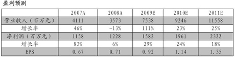 銀河證券預(yù)計,招商地產(chǎn)2009年來自于房地產(chǎn)的銷售收入約60億元,物業(yè)租賃5.5億元。2009年主營收入約76億元,歸屬于母公司凈利潤16.65億元,每股收益0.97元。