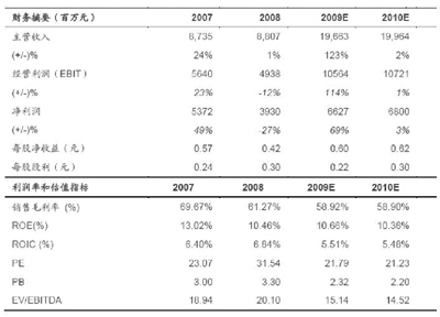 公司預計在2009年6月30日前完成目標資產(chǎn)交割的前提下,2009年歸屬于母公司所有者凈利潤能達到63億左右,每股收益達到0.575元,相對2008年有較大幅度提升。