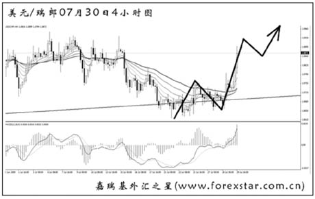 ▲美元兌瑞郎在小幅跌破了旗型下沿之后轉(zhuǎn)身發(fā)力上行,中線看空的思路需暫緩。從波浪角度分析,目前美瑞處于3浪上漲中,后市還有第5浪的上沖。下周美瑞重新向1.1000上方發(fā)起沖擊的希望較大。