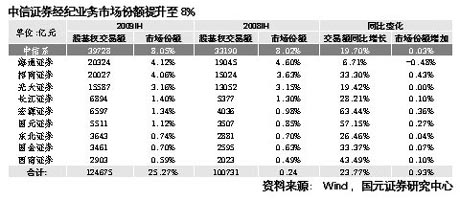 中信證券一直是國(guó)內(nèi)投資銀行業(yè)務(wù)的龍頭券商。根據(jù)中國(guó)證券業(yè)協(xié)會(huì)統(tǒng)計(jì),2007、2008年公司股票及債券承銷總金額為1354.06億元、1119.33億元,分別居行業(yè)第二和第一位。