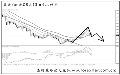▲美元兌加元匯價(jià)反彈上行,4小時(shí)圖道氏理論的最后一個(gè)顯著高點(diǎn)1.0935也被小幅升破,但中線跌勢(shì)沒(méi)有任何改變,操作上需尋找上方拋空的機(jī)會(huì)。