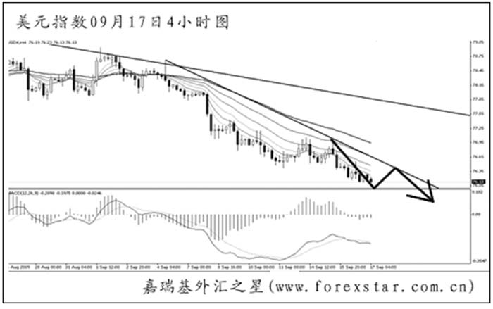 美元指數(shù)經(jīng)過1個多月的盤整之后再度走低,77.65的支撐被跌破后,下方近期已無明顯的點位能夠托住美元下挫。日線圖下降趨勢線的壓制作用良好,且短線的下行斜率也逐漸加大。盡管日線圖MACD的底背離信號不斷發(fā)出,但目前仍以看空美元為主。