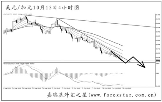 ▲美元兌加元持續(xù)發(fā)生MACD底背離信號,但由于下降趨勢線遲遲沒有突破,美加的跌勢料將延續(xù)。美加即將挑戰(zhàn)1.0000的整數(shù)關(guān)卡,若跌破,將再度打開近千點的下行空間。