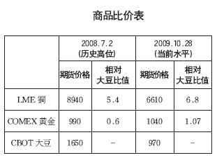 二是周邊商品比價失衡,將提振資金入市農(nóng)產(chǎn)品信心。在未來宏觀背景向好情況下,資金無疑將加速入市,而相對金屬,比價偏低的農(nóng)產(chǎn)品將再次吸引眼球(見下表)。