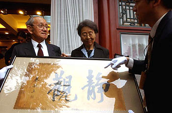 2004年9月15日,毓嶦老先生(左一)將珍藏的一幅恭王府字畫遞交到工作人員手里,這幅字畫是恭王府管理中心獲贈的第一件王府文物。新華社記者 李石磊