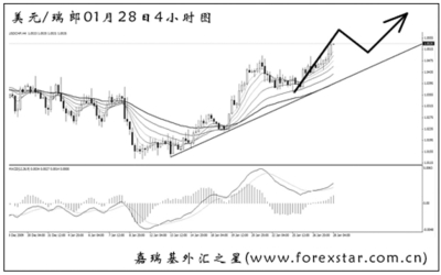 ▲美元兌瑞郎創(chuàng)出了去年12月下旬以來(lái)的新高,短線(xiàn)的上漲斜率加大,匯價(jià)逐步遠(yuǎn)離上升趨勢(shì)線(xiàn)。日線(xiàn)圖上看,均線(xiàn)系統(tǒng)已轉(zhuǎn)為向上排列,從此前第一波反彈的幅度測(cè)算,美瑞至少還有200多點(diǎn)的上漲空間。短線(xiàn)需警惕匯價(jià)向趨勢(shì)線(xiàn)一帶回調(diào)的風(fēng)險(xiǎn)。